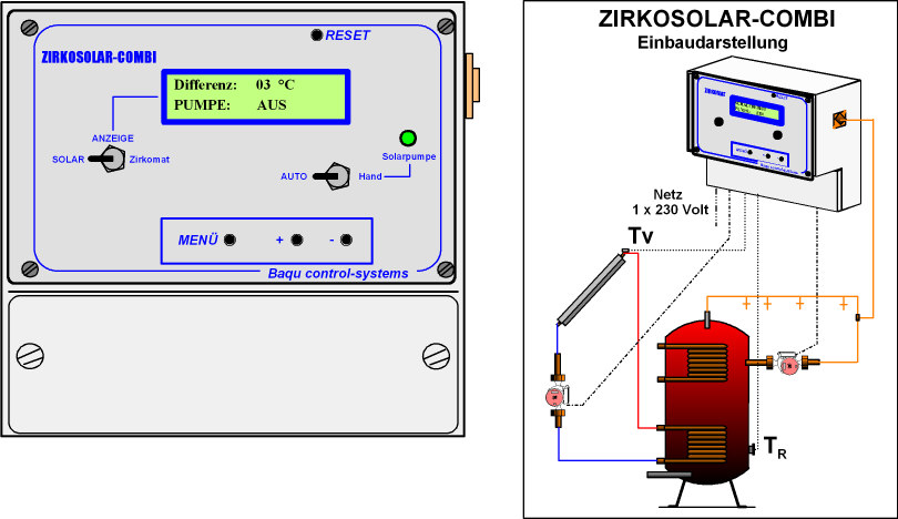 Die Kombination einer Temperaturdifferenz-Steuerung mit unserem Auswerteverfahren für die verbrauchsabhängige Schaltung der Zirkulationspumpe ergibt das wirtschaftliche Kombigerät ZIRKOSOLAR-COMBI für die Standardbrauchwasser-Solaranlage, ohne Verzicht auf den Komfort einer Warmwasserzirkulation.